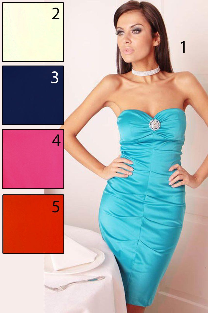 Элегантное однотонное коктейльное платье "бандо" классического приталенного силуэта с защипами по всей длине изделия, на подкладке, идеально подходящее для любой фигуры. Лиф уплотнен чашечками пуш-ап и украшен элегантной брошью, застежка - на спинке потайная молния.